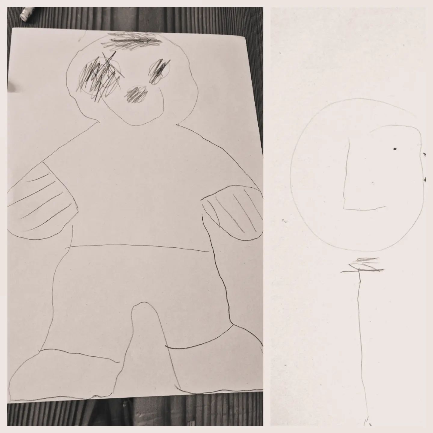 Per esemplificare qui sopra 2 disegni fatti da lui, a distanza di un anno: il primo disegno sembra una cosa normale ma paragonato all' inizio è fantascienza. Finalmente una rappresenzazione corporea che prende vita, un sentirsi e un percepirsi, due mani che si esprimono in maniera decisa in un tratto grafico un pò come a dire che in questo mondo fatto di abbandoni, di guerre, di fughe...si proprio in questo mondo qui IO esisto, CI SONO e passo dopo passo imparerò a viverci a MODO MIO.
